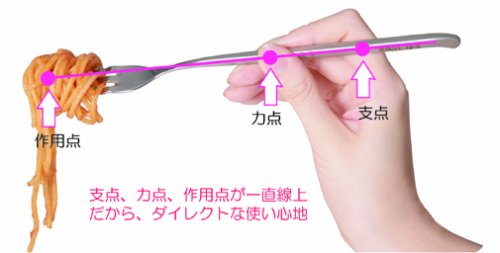 - フォーク部両サイドの歯をウェーブ状にし、スッと上げただけで麺がすべらずに持ち上がる