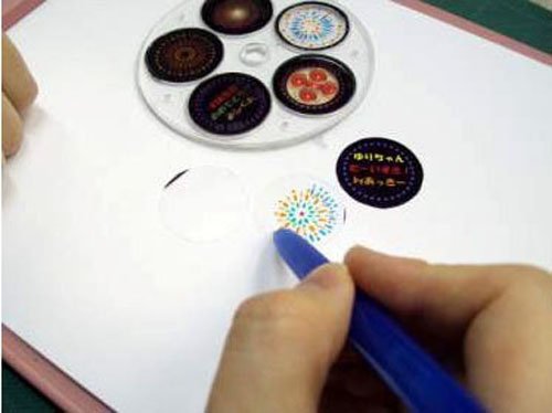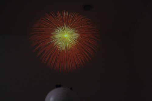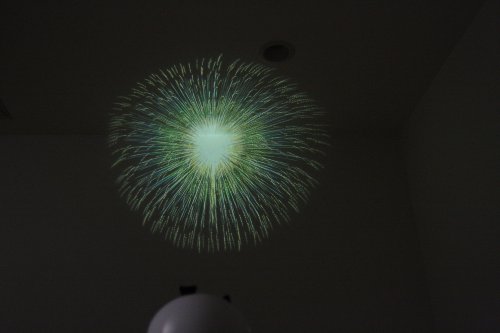 5種類の花火がセットされたカートリッジを差込み、スイッチを押すだけですぐにお家で花火大会がスタート。 花火は全部で55種類。シチュエーションにあわせた花火を楽しめる。 付属のフィルムと油性ペンでオリジナル花火を作ることができる。 パソコンで作成した画像をOHPフィルムに印刷して打ち上げることもできる。