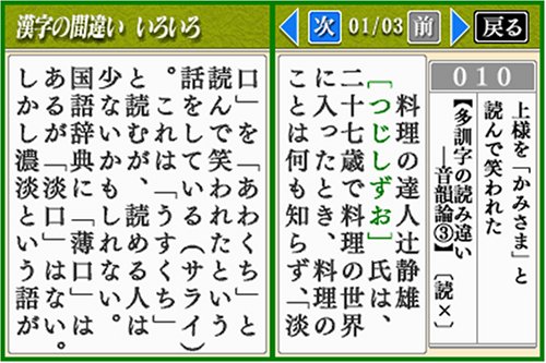 メーカーより ■ 商品説明 普段、なにげなく読んでいる新聞や雑誌に使われている漢字を、あなたは正しく読み書きできますか? 100万部突破の大ベストセラー 『読めそうで読めない漢字2000』の他、『書けそうで書けない漢字2000』『あってるつもりで間違ってる漢字』(ともに講談社+α文庫、加納喜光著)からの出典により、大人ならキチンと知っておきたい漢字の知識や雑学を幅広く網羅した、日常で本当に役立つ漢字力養成ソフトです。 ■ 文字の入力システム 松下電器産業製「手書き文字認識エンジン"楽ひら"」の採用により、スムーズで快適な手書き入力ができます。 ■ 収録内容 ・ 漢字力診断 ・ 読めそうで読めない漢字・・・間違って読んでいる漢字、曖昧にごまかして読んでいる漢字のチェックができます。 ・ 書けそうで書けない漢字・・・普段良く見ている漢字でも、いざ書こうとすると書けなくなる漢字のチェックができます。 ・ カンチガイ漢字・・・・・・・点がつくかつかないか、はねるかはねないか、などの思い込みによる漢字の勘違いをチェックします。 ・ 漢字間違い探し・・・・・・・書き間違い、読み間違いしやすい漢字の、正しい知識をチェックします。 ・ うんちく ・ いろいろな読み方・・・・・・漢字の読み方に関する、さまざまなルールや考えかたをまとめたコラムです。 ・ 漢字の間違い いろいろ・・・新聞や雑誌で実際に使用された漢字の間違いを、実例とともに紹介するコラムです。 ・ 漢字の成り立ち・・・・・・・漢字の語源、成り立ちをわかりやすく解説しています。 ・ ゲーム ・ 3種類の漢字ゲーム(漢字タスケス、漢字ジグソー、漢字しりとり)で、遊びながら漢字力を鍛えられます。 ■ こんな人にオススメ! ・ 日常で恥ずかしくない漢字力を身につけたい、社会人・主婦の方々 ・ 漢字力に自信があり、自分の実力を試したい方々 ・ 漢字検定の上級合格者、及び上級受験予定者 ■ 監修 茨城大学名誉教授 加納喜光 |
